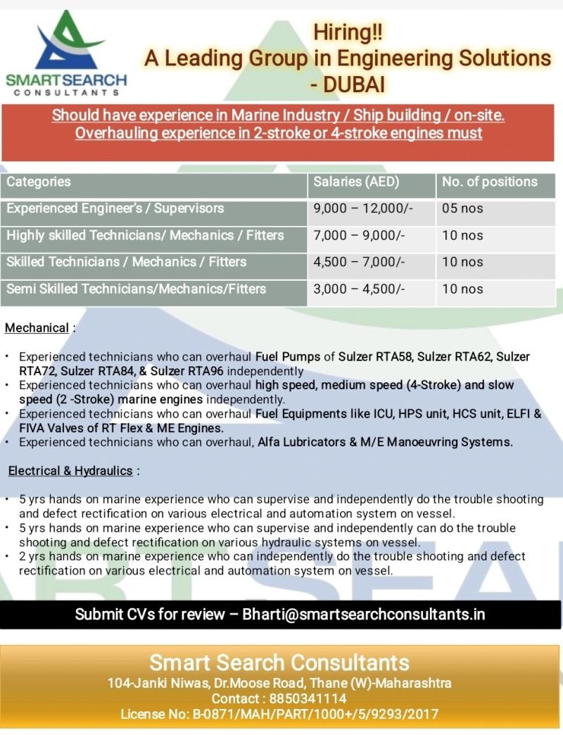 Smart Search Consultants is recruiting for a leading engineering solutions group in Dubai. Candidates with experience in the marine industry, shipbuilding, or on-site overhauling of 2-stroke or 4-stroke engines are encouraged to apply. Submit your CV now!