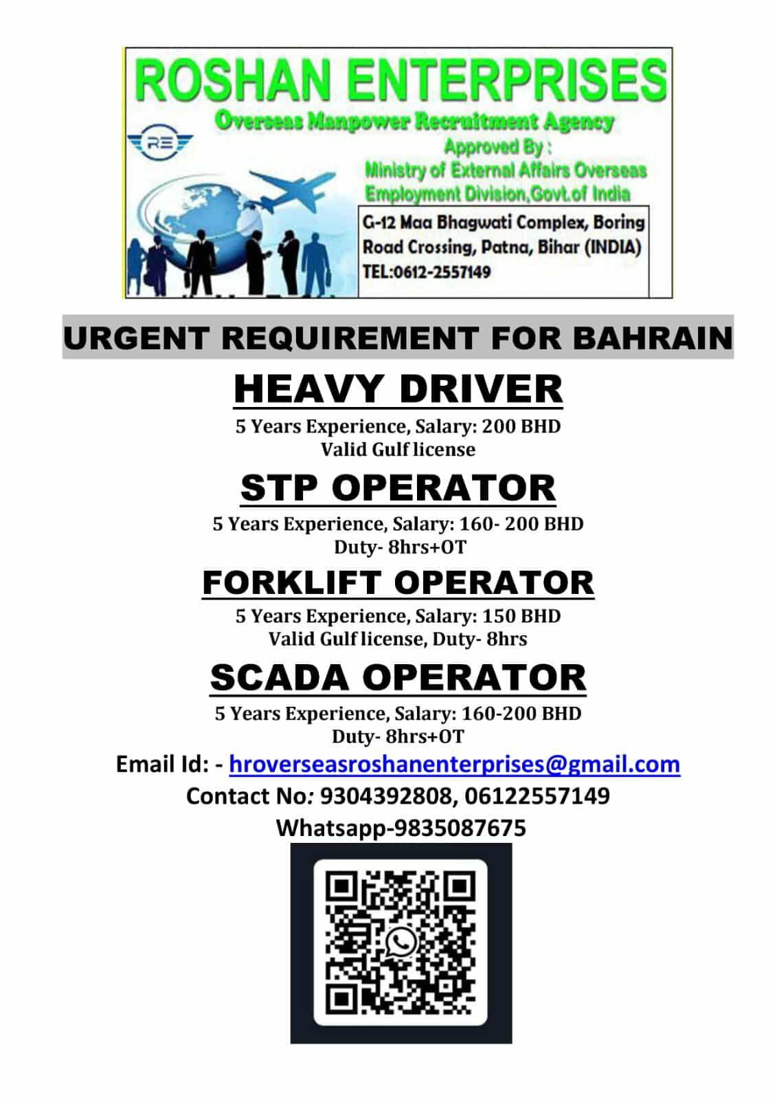 Looking for a job opportunity in Bahrain? Roshan Enterprises, an approved overseas manpower recruitment agency by the Ministry of External Affairs, Govt. of India, is hiring urgently. Apply now for roles like Heavy Driver, STP Operator, Forklift Operator, and SCADA Operator!