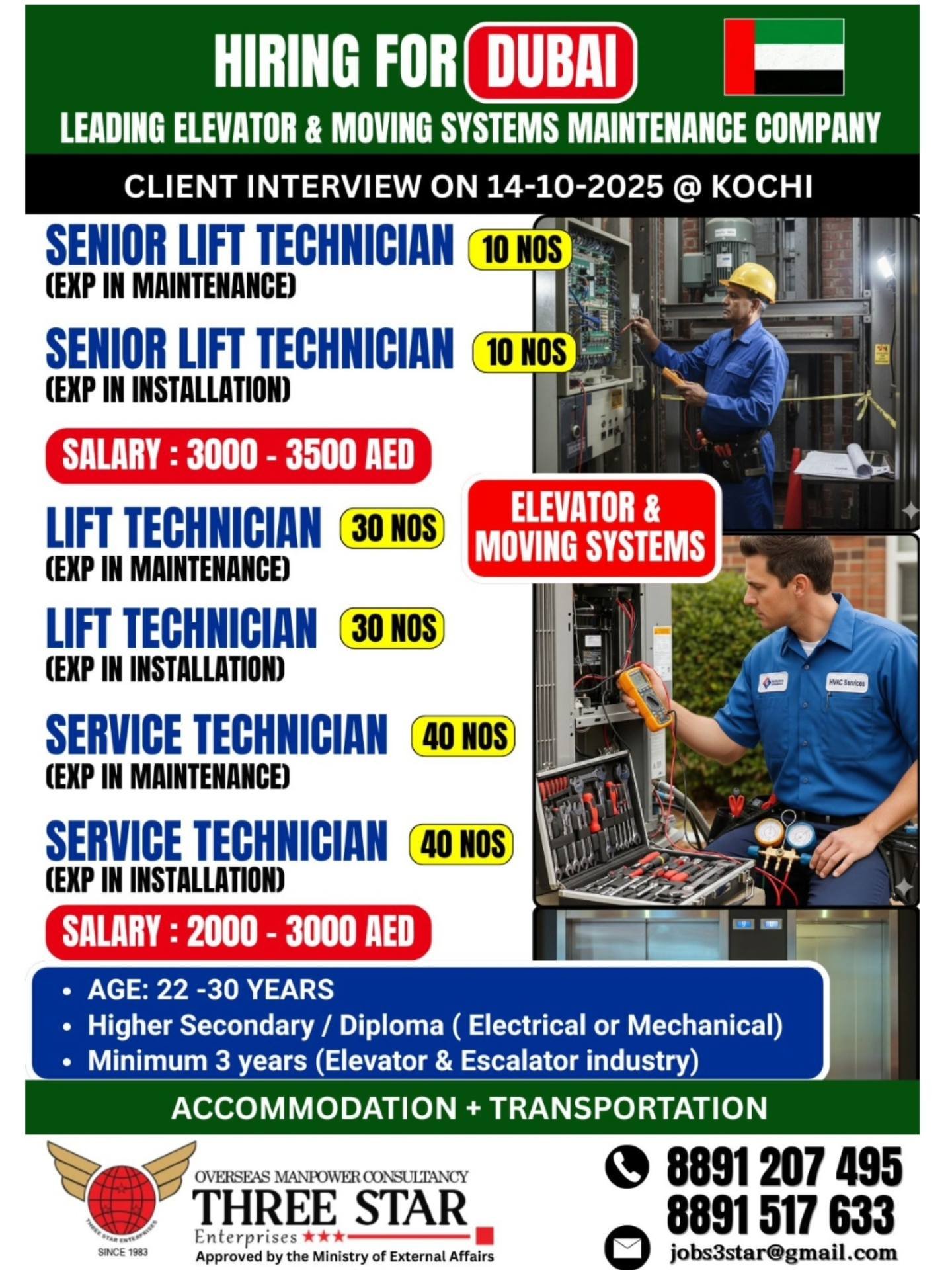 Explore exciting career opportunities with a leading elevator and moving systems maintenance company in Dubai. Three Star Enterprises is conducting client interviews on 14-10-2025 at Kochi. Apply now for roles like Senior Lift Technician and Service Technician with competitive salaries!