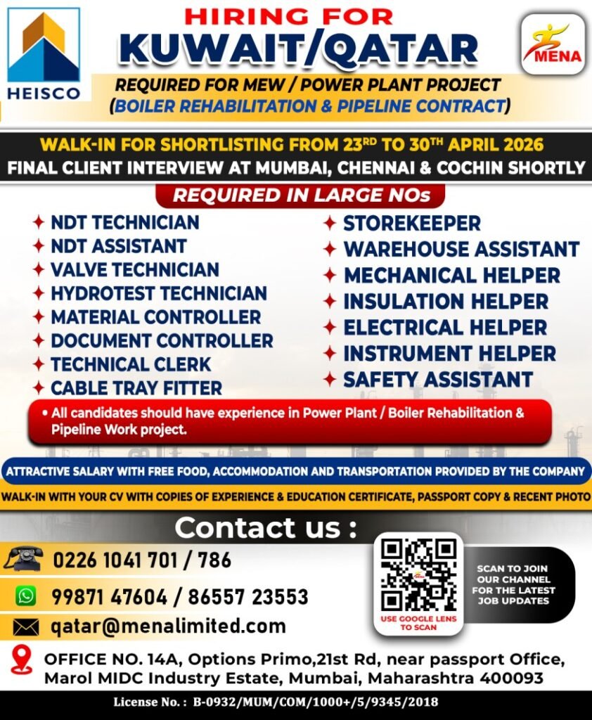 Urgent Hiring for Kuwait & Qatar – MEW/Power Plant Project
