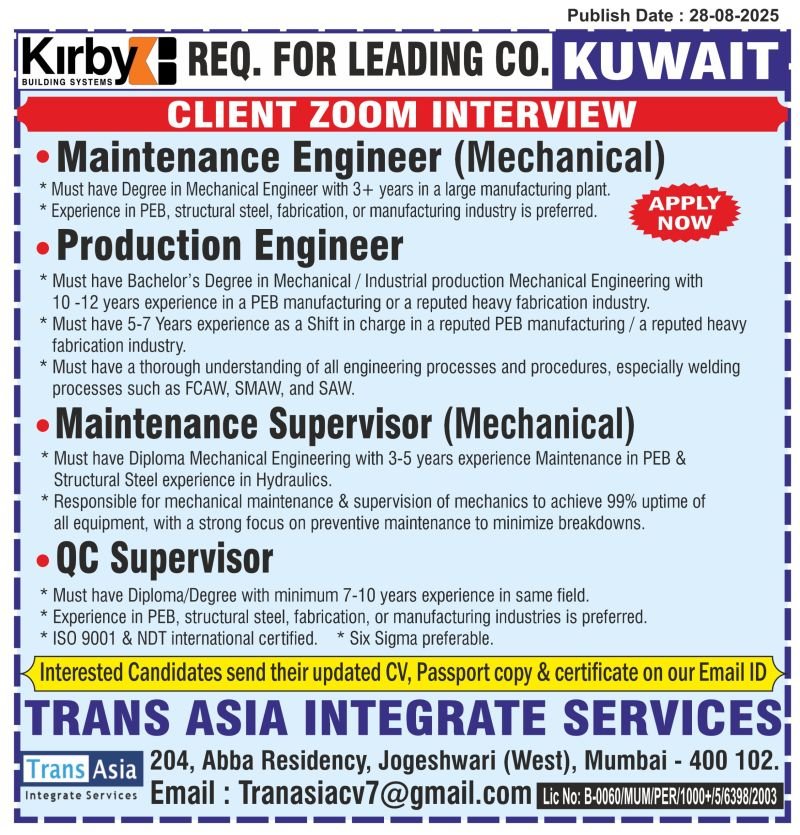 Maintenance Engineer | Production Engineer | Maintenance Supervisor | QC Supervisor