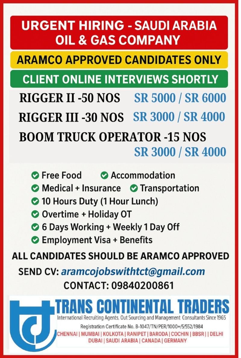 Trans Continental Traders is urgently hiring Aramco-approved candidates for an oil & gas company in Saudi Arabia. Client online interviews are scheduled shortly. Apply now for lucrative roles with excellent benefits!