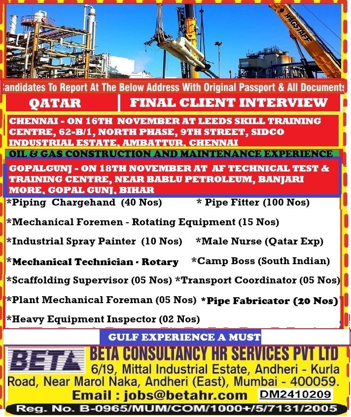 Walk-in to our MUMBAI office for shortlisting and scheduling interview OR send biodata and document copies to Email: resume@betahr.com