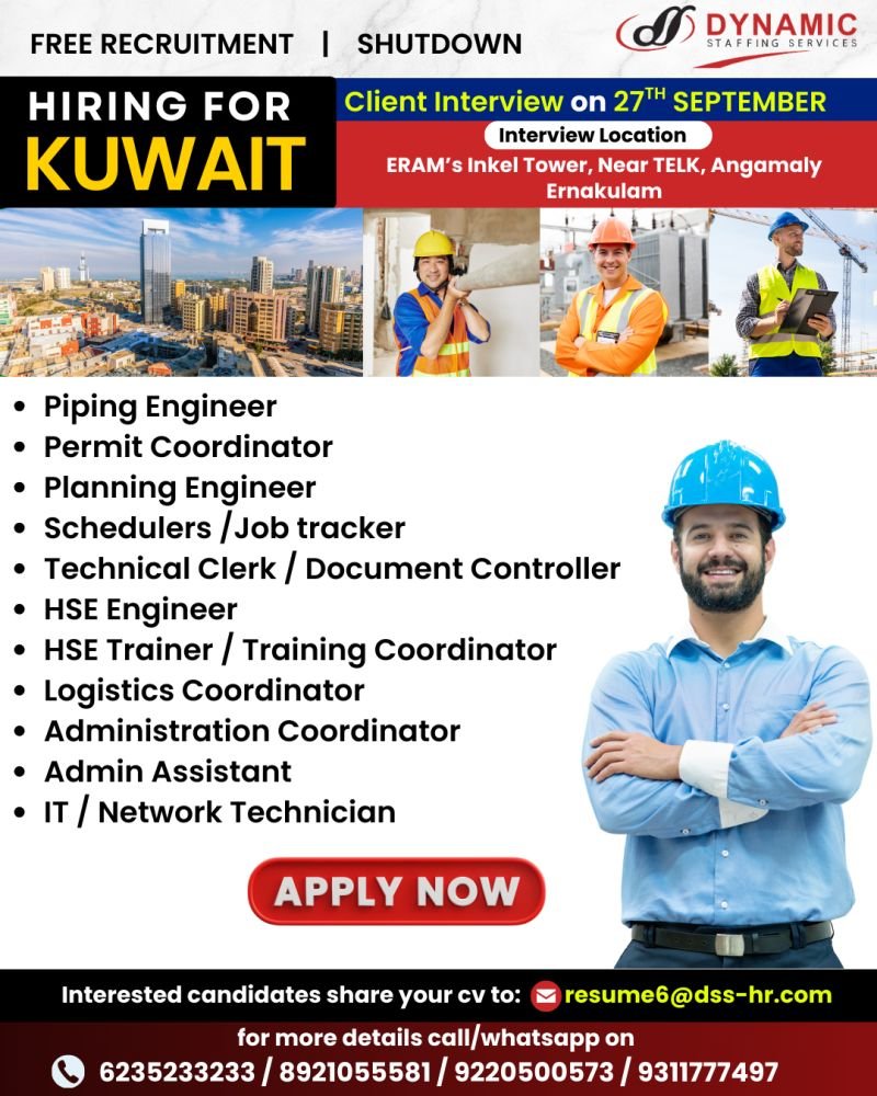 🔧 Free recruitment for shutdown projects with client interview scheduled on 27th September at ERAM’s Inkel Tower, Near TELK, Angamaly, Ernakulam.