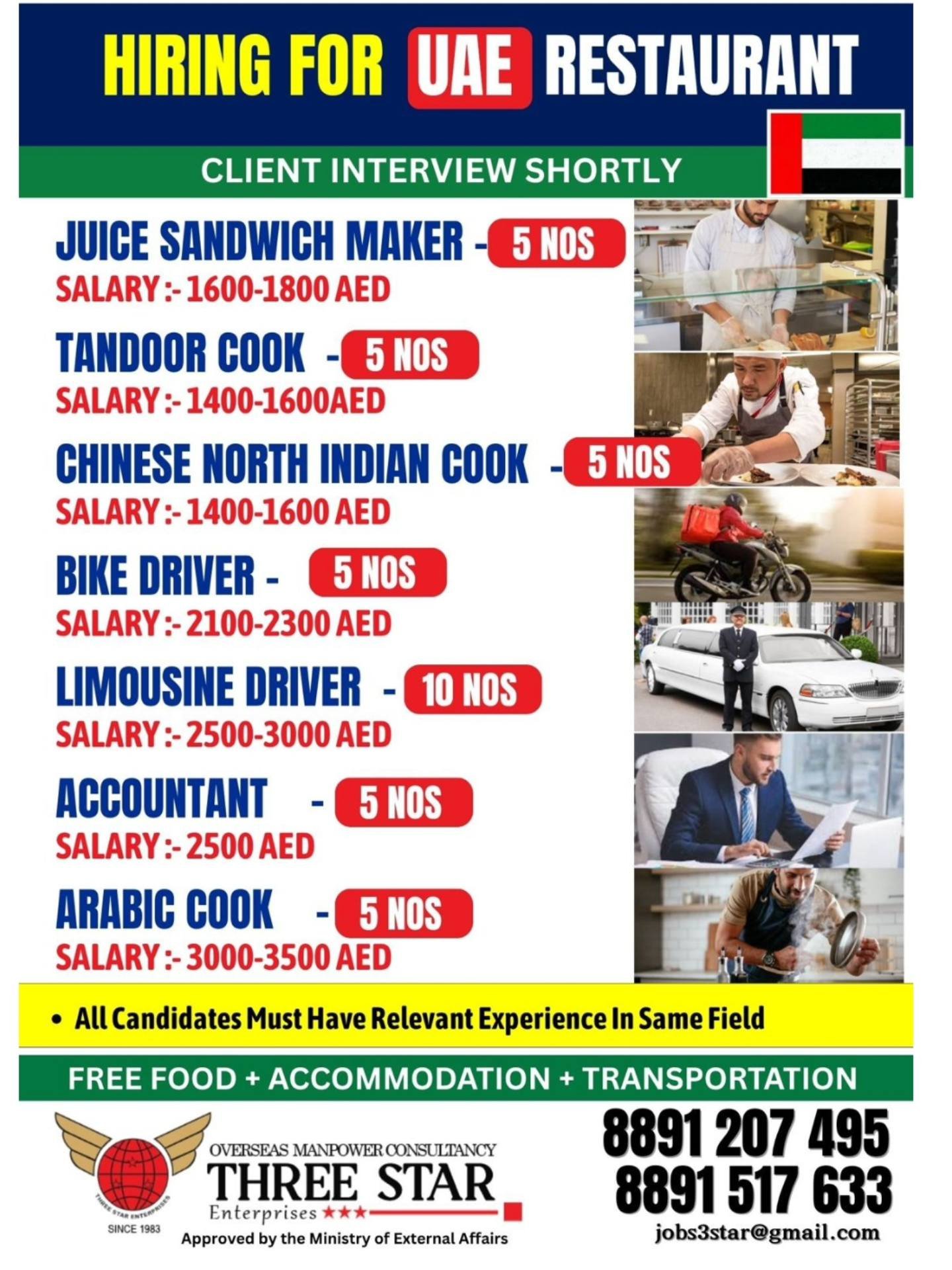 Looking for exciting job opportunities in the UAE? Three Star Enterprises is recruiting for various restaurant and driver positions. Client interviews are scheduled shortly—apply now for roles like Juice Sandwich Maker, Tandoor Cook, and more with attractive salaries!