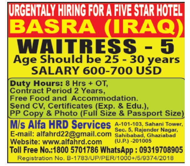 Are you a young professional seeking an exciting career opportunity? Ms Alfa HRD Services is urgently hiring waitresses for a prestigious five-star hotel in Basra, Iraq. Apply now for immediate consideration!