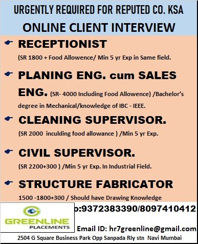 Are you an experienced professional in reception, planning, supervision, civil, or fabrication seeking lucrative Saudi Arabia jobs? A reputed company in KSA is urgently recruiting skilled Indian candidates through Greenline Placements, a trusted overseas recruitment agency based in Navi Mumbai.