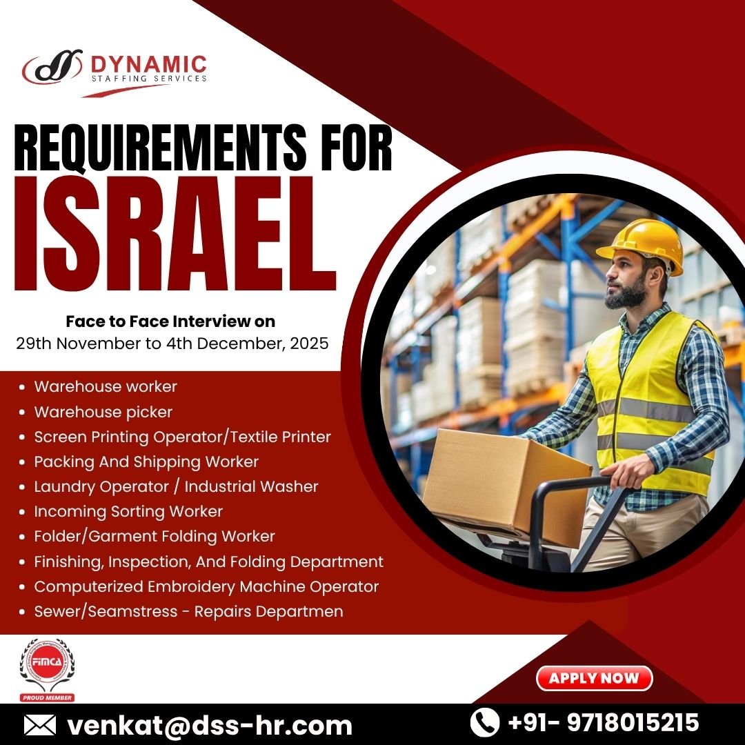 HIRING FOR ISRAEL Leading garment, textile & logistics companies in Israel recruiting entry-level & skilled workers for modern factories & warehouses. Face-to-face client interviews from 29th November to 4th December 2025 (venue to be announced). No prior experience needed for most roles – training provided. Attractive salary + overtime + free accommodation + food!