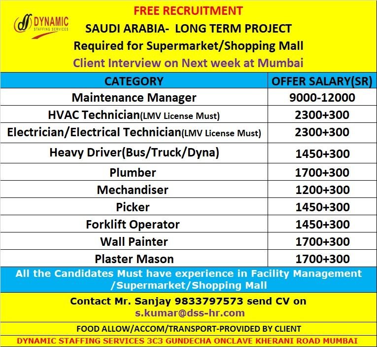 Urgent Job Opening for Saudi for Supermarket/Shopping Mall-Long Term Project
