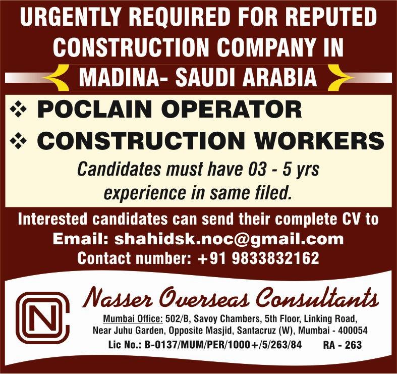 Nasser Overseas Consultants is urgently hiring for a reputed construction company in Madina, Saudi Arabia. This is an excellent opportunity for experienced professionals to advance their careers. Apply now!
