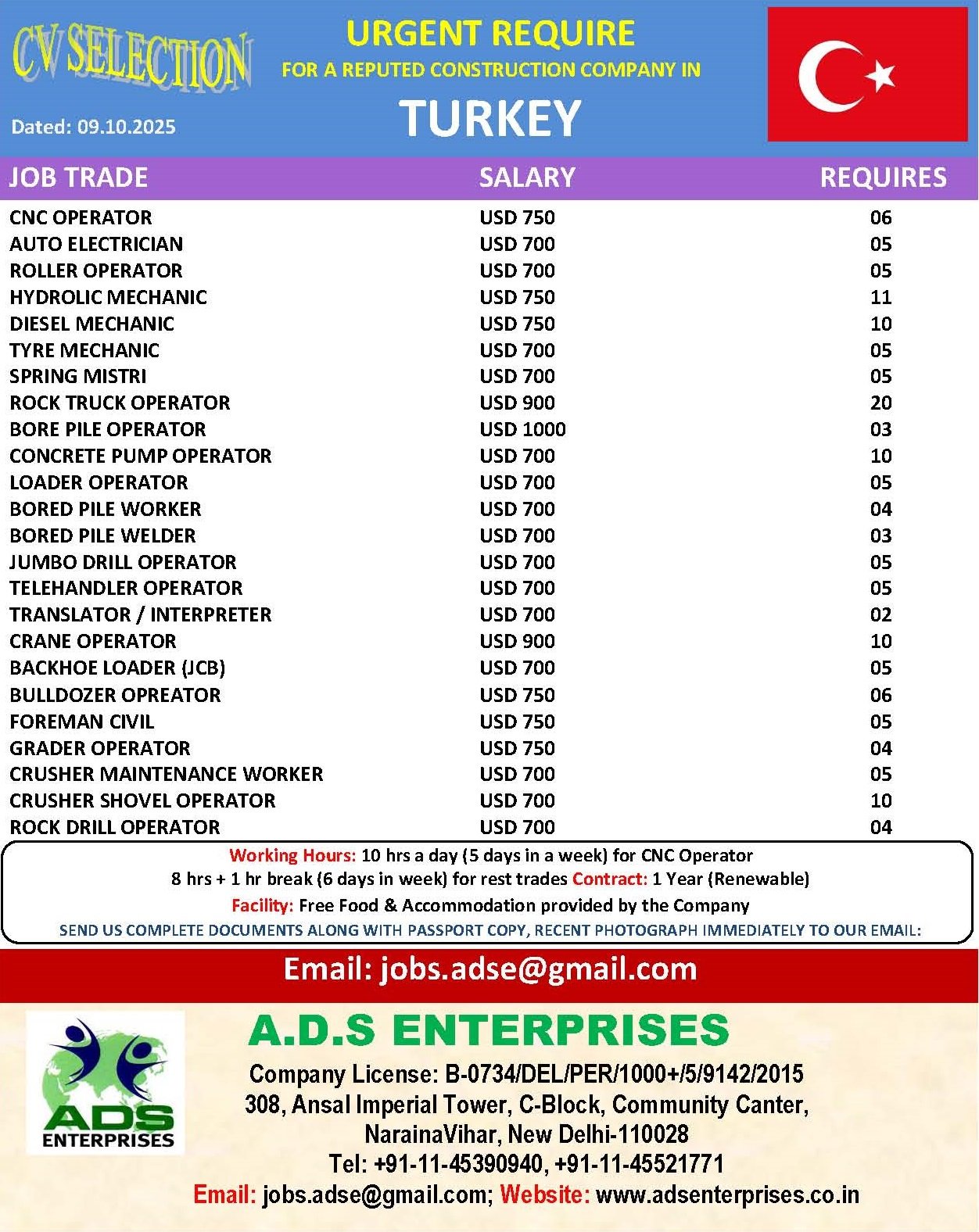 A.D.S Enterprises is excited to announce urgent job openings for a reputed construction company in Turkey. CV selection is ongoing as of 09.10.2025. Apply now for a chance to work in a thriving construction sector!