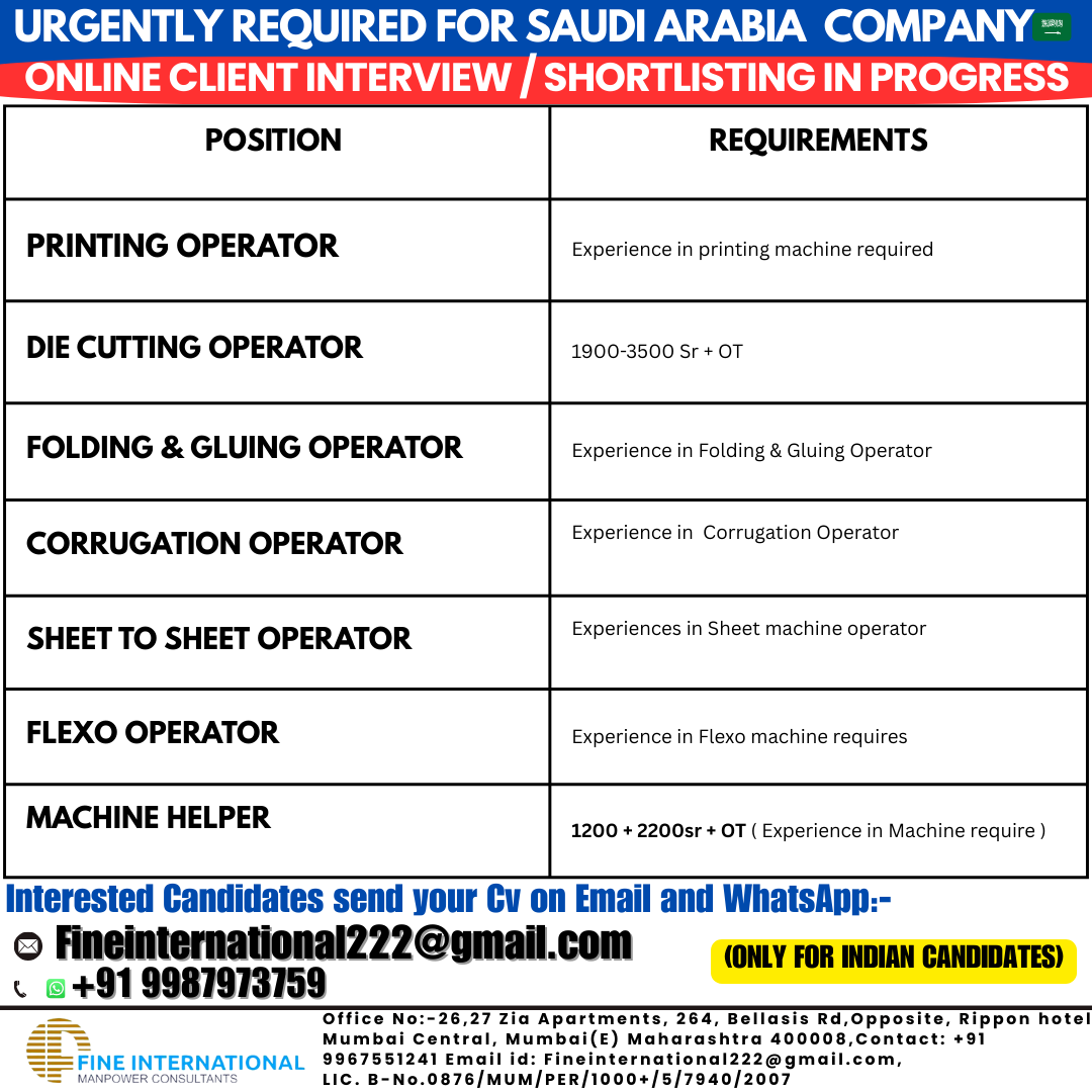 Fine International Manpower Consultants is urgently recruiting for a Saudi Arabia company. Online client interviews and shortlisting are in progress. Secure your position with competitive salaries and benefits!