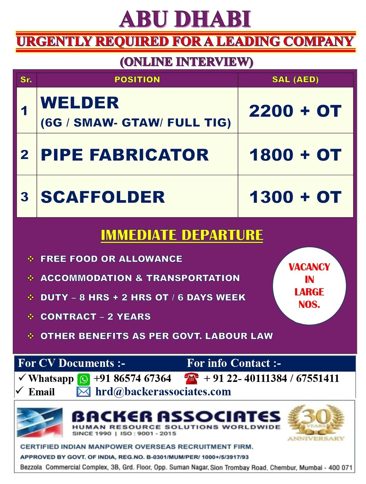 Are you looking for exciting job opportunities abroad? A leading company in Abu Dhabi is urgently hiring for the positions of Welder, Pipe Fabricator, and Scaffolder. With immediate departure and attractive salaries, this is your chance to kickstart a rewarding career! Read on to learn more about these vacancies and how to apply.