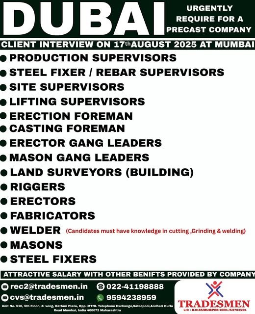 Tradesmen is excited to announce urgent recruitment for a precast company in Dubai. A client interview is scheduled for 17th August 2025 at Mumbai. Don’t miss this opportunity to join with attractive salaries and other benefits provided by the company!
