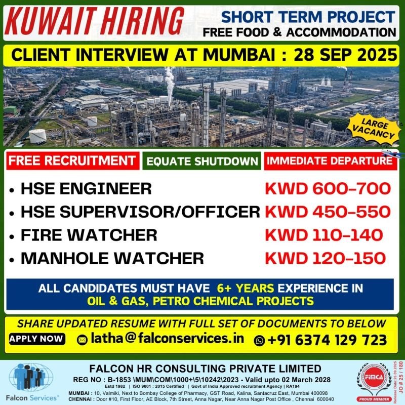 Are you an experienced professional in the oil, gas, and petrochemical industry? Falcon HR Consulting Pvt Ltd is hiring for a short-term project with Equate Shutdown in Kuwait. With a client interview scheduled for 28 Sep 2025 in Mumbai, free recruitment, free food, accommodation, and immediate departure, this is a golden opportunity. Apply today!