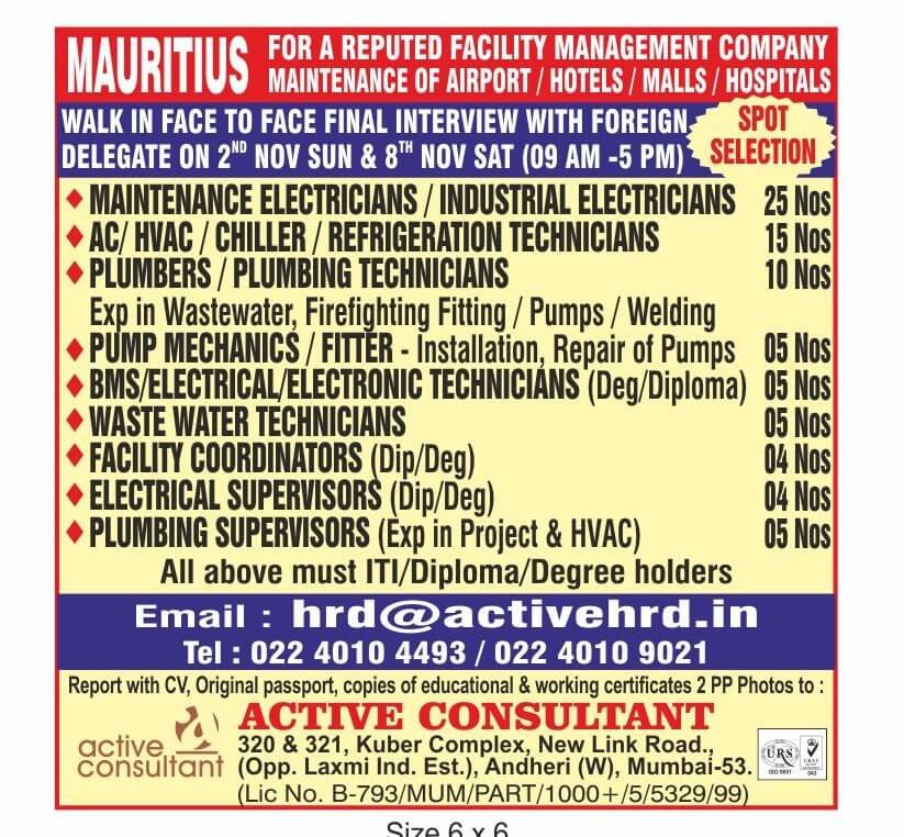 A reputed facility management company in Mauritius is hiring for maintenance roles across airports, hotels, malls, and hospitals. Walk-in face-to-face final interviews with foreign delegates are scheduled on 2nd Nov (Sun) & 8th Nov (Sat) from 09 AM – 5 PM. Apply now for spot selection!
