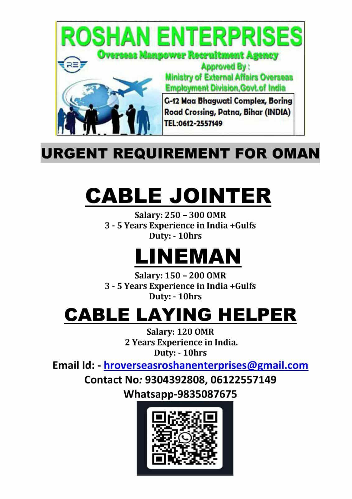 Roshan Enterprises, an approved Overseas Manpower Recruitment Agency by the Ministry of External Affairs, Government of India, is seeking candidates for urgent positions in Oman. Apply now!
