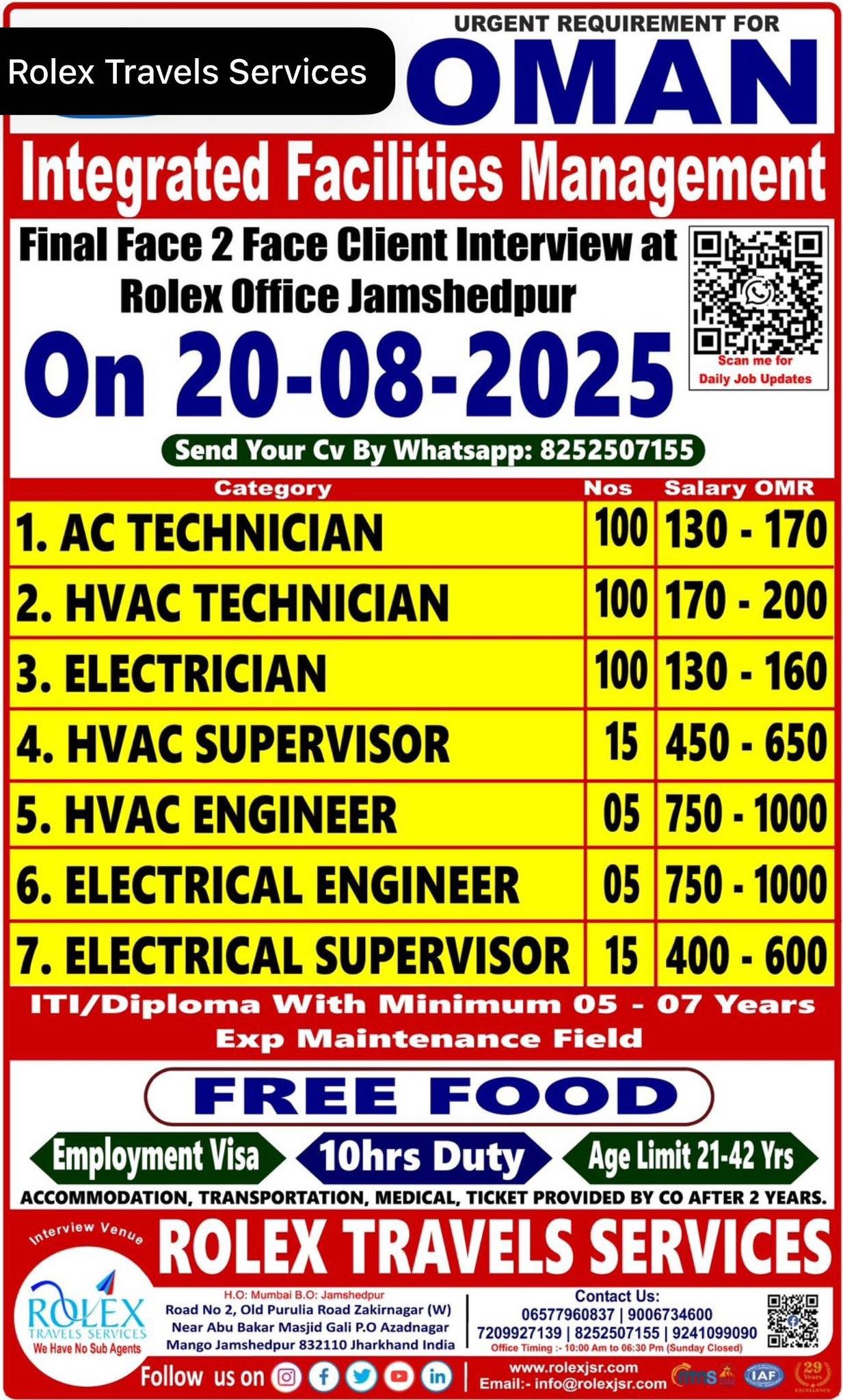 Explore exciting career opportunities in Oman with Rolex Travels Services. Attend the final face-to-face client interview on August 20, 2025, at the Rolex Office Jamshedpur. Enjoy free food, employment visa, and attractive benefits!