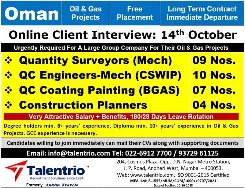 Talentrio, a leading recruitment firm since 1994, is urgently hiring for a large group company in Oman for their Oil & Gas projects. Join with a free placement and long-term contract, with immediate departure!