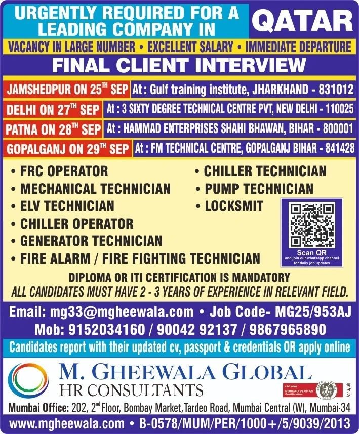 A leading company in Qatar is urgently hiring for a large number of vacancies with excellent salaries and immediate departure opportunities. Attend the final client interview scheduled across multiple locations in India. Apply now!
