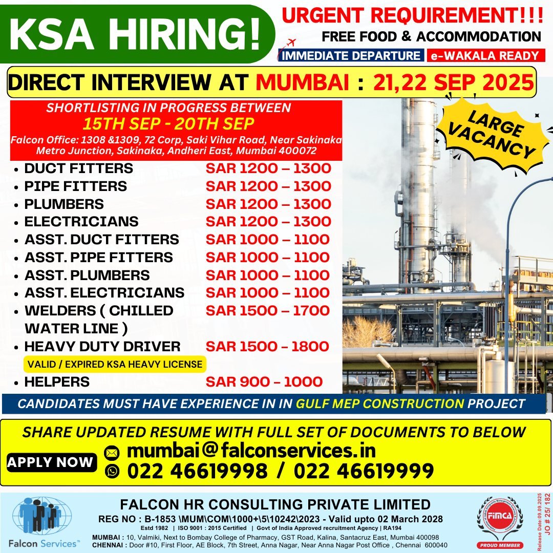A leading company in KSA is urgently hiring with free food, accommodation, and immediate departure (e-Wakala ready). Direct interviews are scheduled for 21, 22 Sep 2025 in Mumbai. Shortlisting is in progress from 15th Sep – 20th Sep 2025. Apply now!