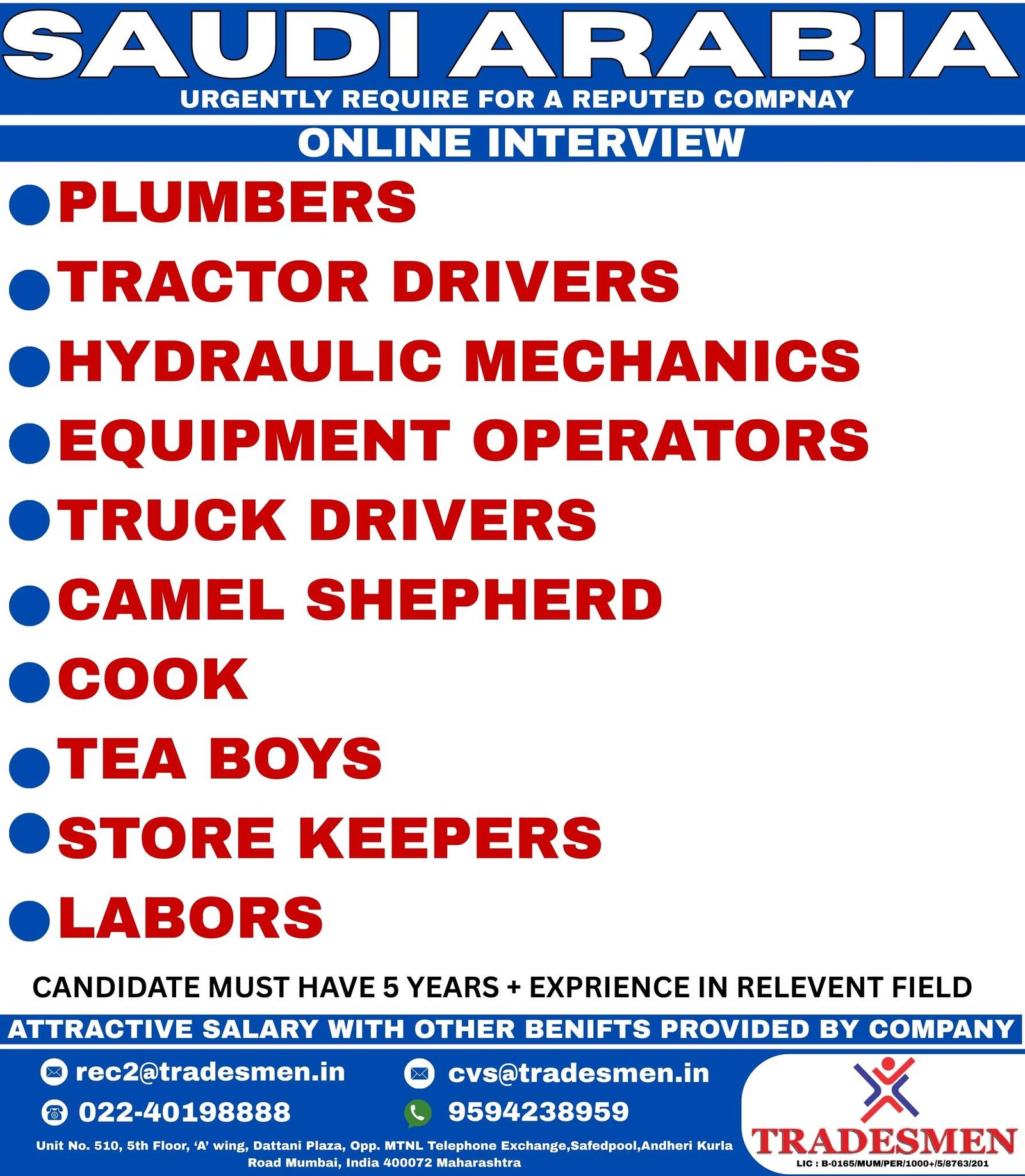 Looking for a career opportunity in Saudi Arabia? A reputed company is urgently hiring for various positions with online interviews. Apply now for attractive salaries and benefits!