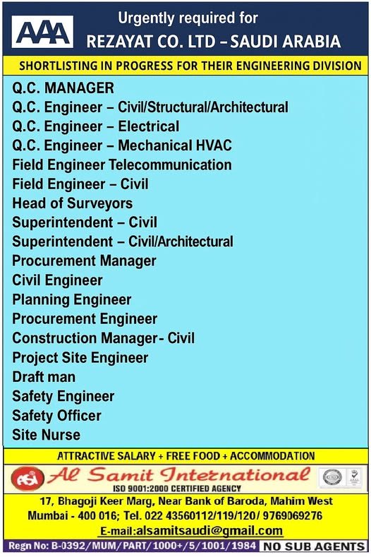 Rezayat Co. Ltd in Saudi Arabia is urgently seeking talented professionals for their engineering division. Shortlisting is in progress for a variety of roles offering attractive salaries, free food, and accommodation. Apply now!
