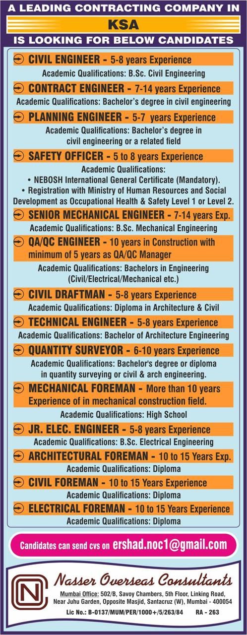 Nasser Overseas Consultants is recruiting for a leading contracting company in KSA. Apply now for various engineering and technical roles!