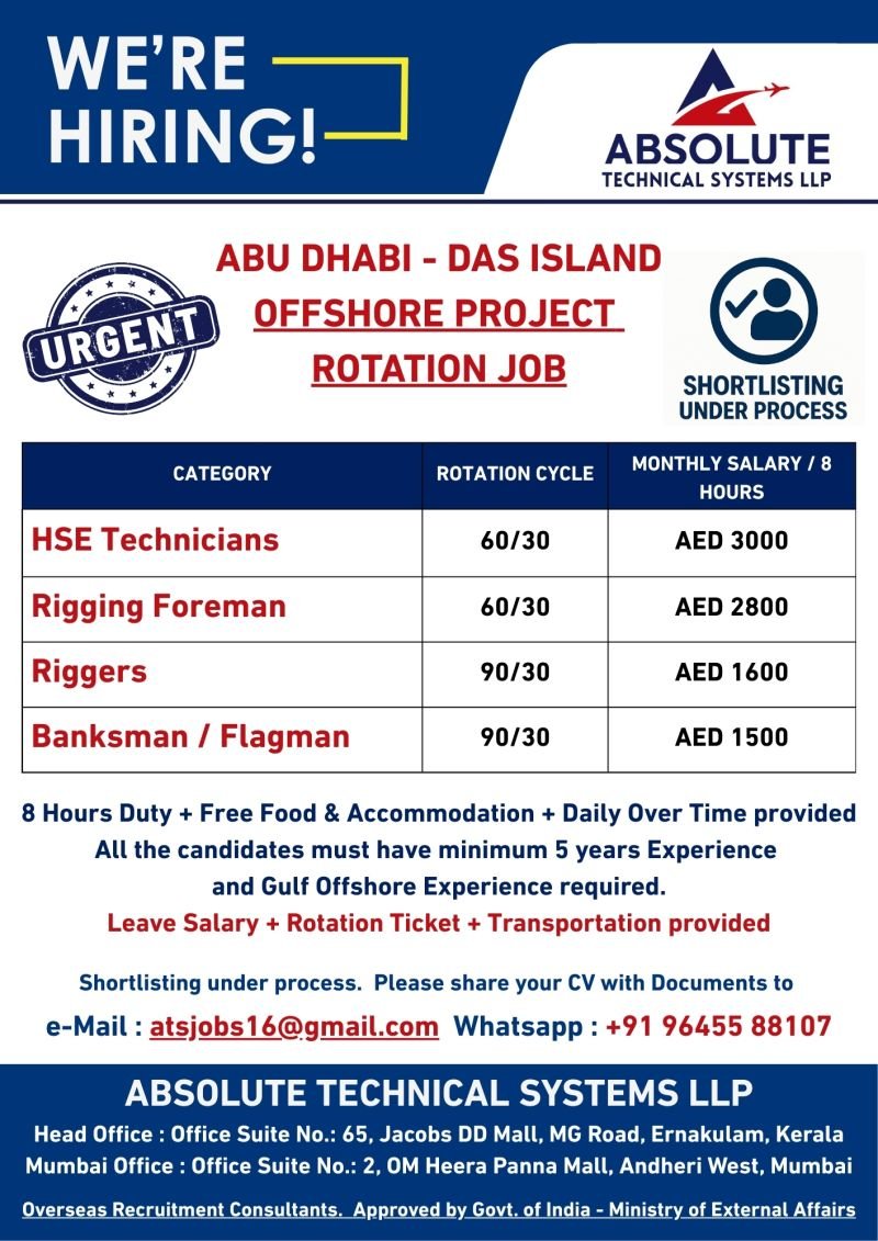 Looking for a rewarding career in the offshore industry? Absolute Technical Systems LLP is hiring for an urgent offshore project on Das Island, Abu Dhabi. With competitive salaries, free food, accommodation, and rotation jobs, this is a great opportunity for experienced professionals. Apply now!