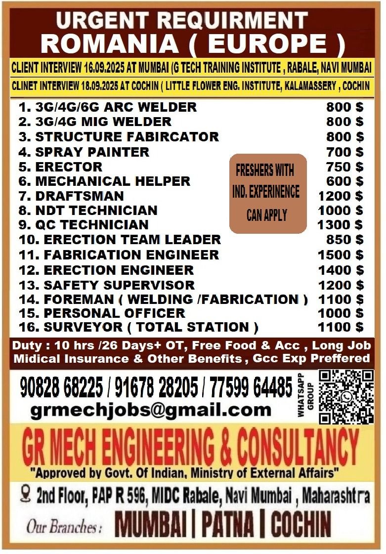 Looking for international job opportunities? GR Mech Engineering & Consultancy is recruiting for various roles in Romania (Europe). Client interviews are scheduled for 16.09.2025 at G Tech Training Institute, Rabale, Navi Mumbai and 18.09.2025 at Little Flower Eng. Institute, Kalamassery, Cochin. Don’t miss out!
