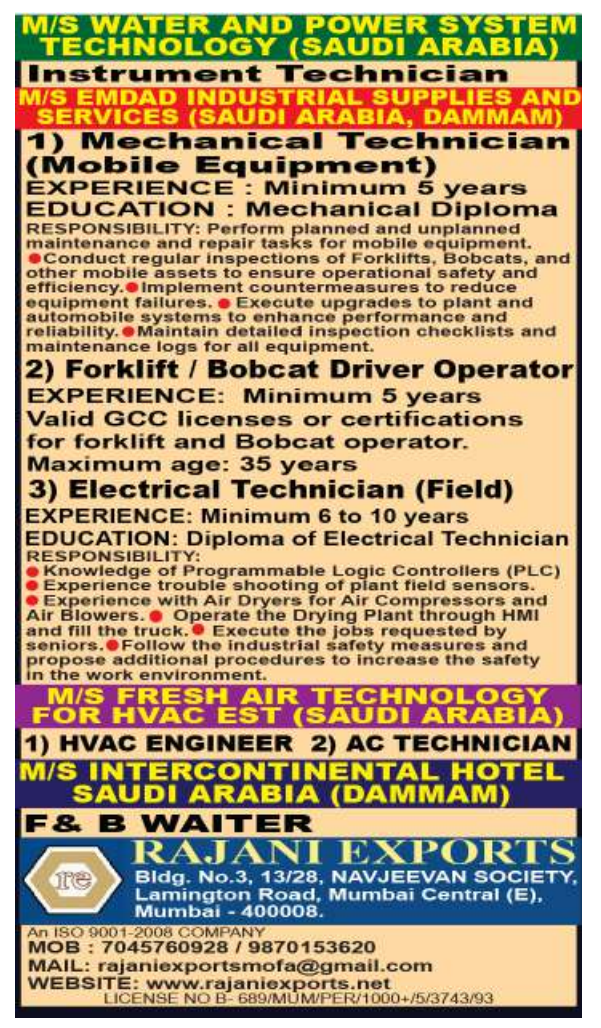 Work with top companies in Saudi Arabia, including M/S Water and Power System Technology, M/S Fresh Air Technology, and M/S Intercontinental Hotel, offering diverse roles and growth opportunities.
