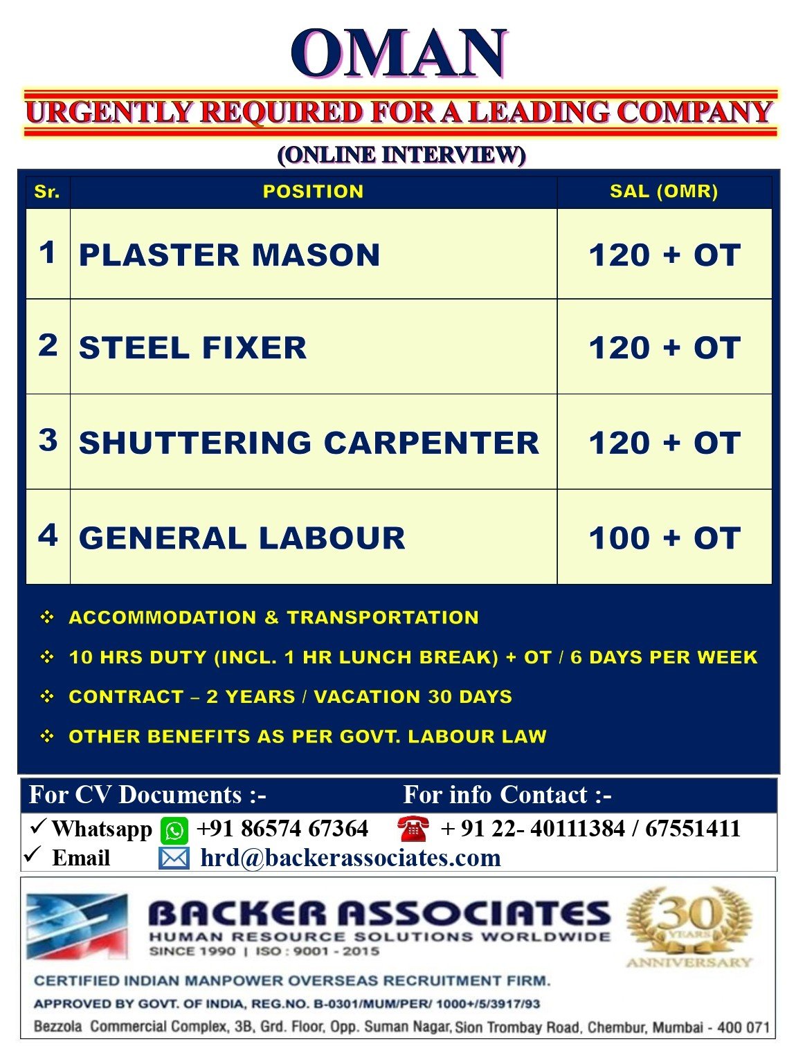 Backer Associates is thrilled to announce urgent job openings for a leading company in Oman. Conducted via online interviews, these positions offer competitive salaries and excellent benefits. Apply now!