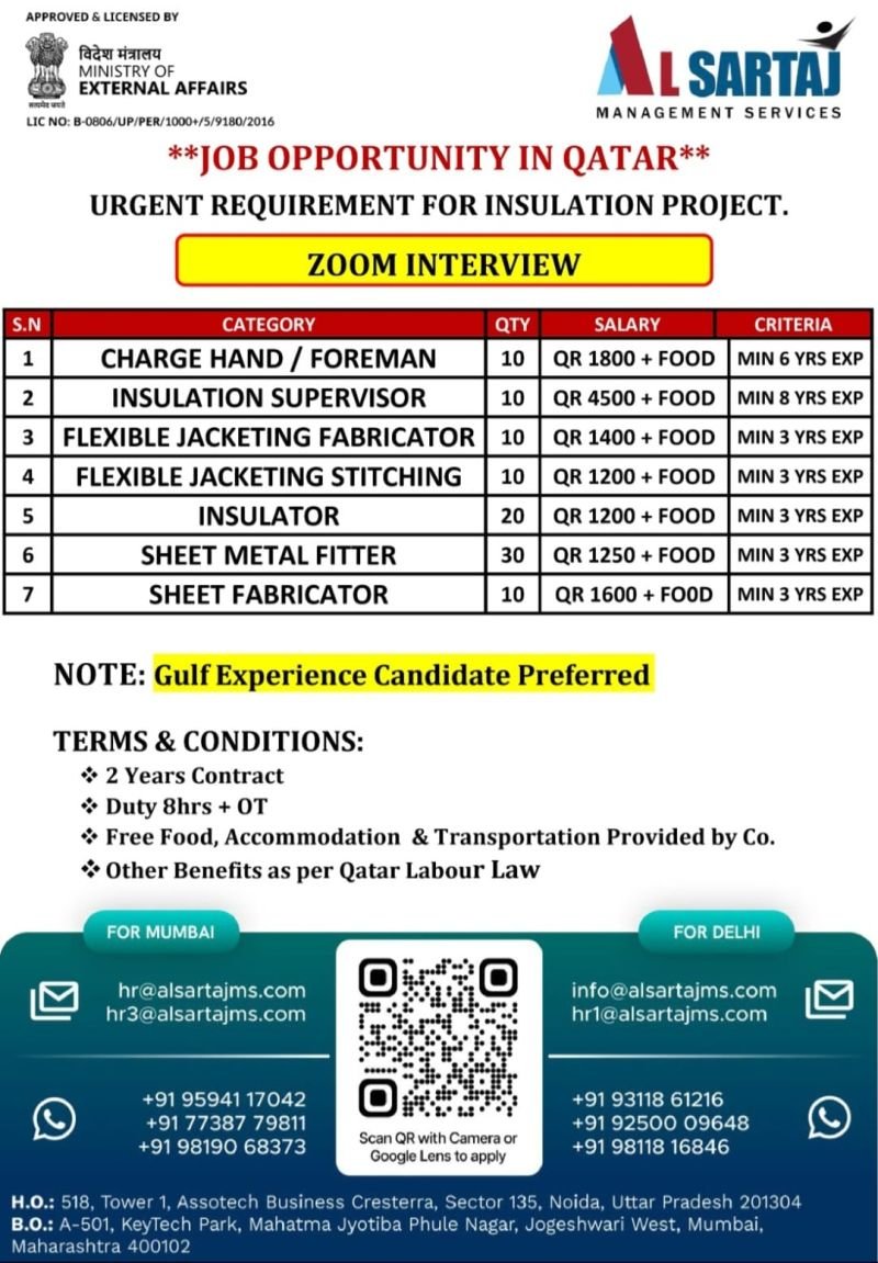 Al Sartaj Management Services is hiring skilled and experienced professionals for a leading Insulation Project in Qatar. If you’re seeking a stable overseas career with excellent benefits, this is a fantastic opportunity to take the next step.