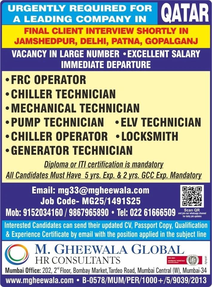 Are you a skilled technician ready for an exciting career move to Qatar? M. Gheewala Global HR Consultants, a trusted ISO-certified and Government of India-approved recruitment agency, is urgently hiring for multiple technical roles in a leading company. With final client interviews scheduled shortly in Jamshedpur, Delhi, Patna, and Gopalganj, this is your chance for excellent salaries, large vacancies, and immediate departure. Don’t miss out on these high-demand Qatar jobs in 2025!