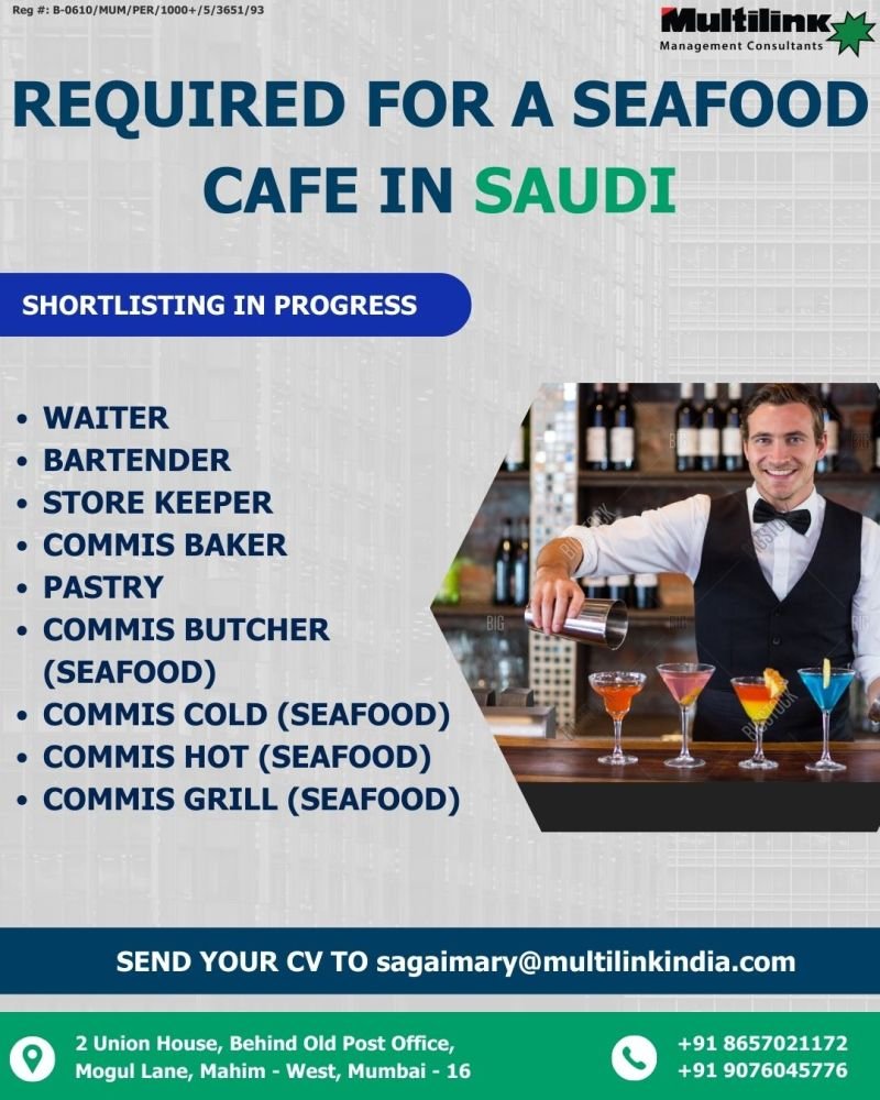 Explore urgent job opportunities in Saudi Arabia with a leading Seafood Cafe. Multilink Management Consultants is currently shortlisting candidates for various roles. This is your chance to join the hospitality industry in Saudi. Apply now!