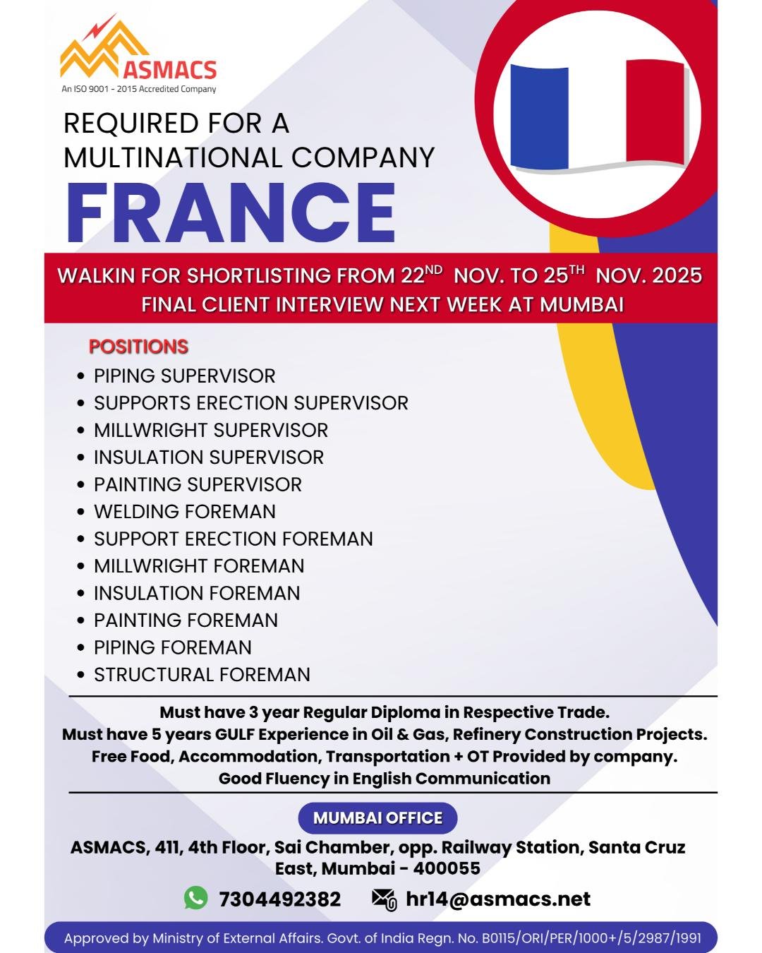 A leading French multinational company with major Oil & Gas and Refinery Construction projects is urgently hiring experienced Gulf-return professionals for long-term employment in France.
