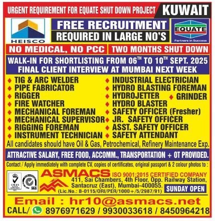 Heisco, an ASMACS Sat Co 9001:2015 certified company, is offering free recruitment for a large number of vacancies in the Equate Shutdown Project in Kuwait. With no medical or PCC required and a two-month shutdown, this is a prime opportunity! Walk-in interviews are scheduled from 06th to 10th September 2025 at Mumbai next week.