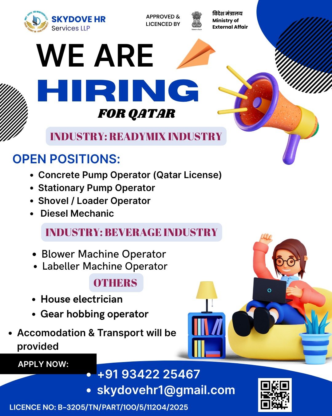 SkyDove HR Services LLP, a Government of India approved & licensed recruitment agency (Ministry of External Affairs), is conducting 100% free recruitment for multiple positions in Qatar.