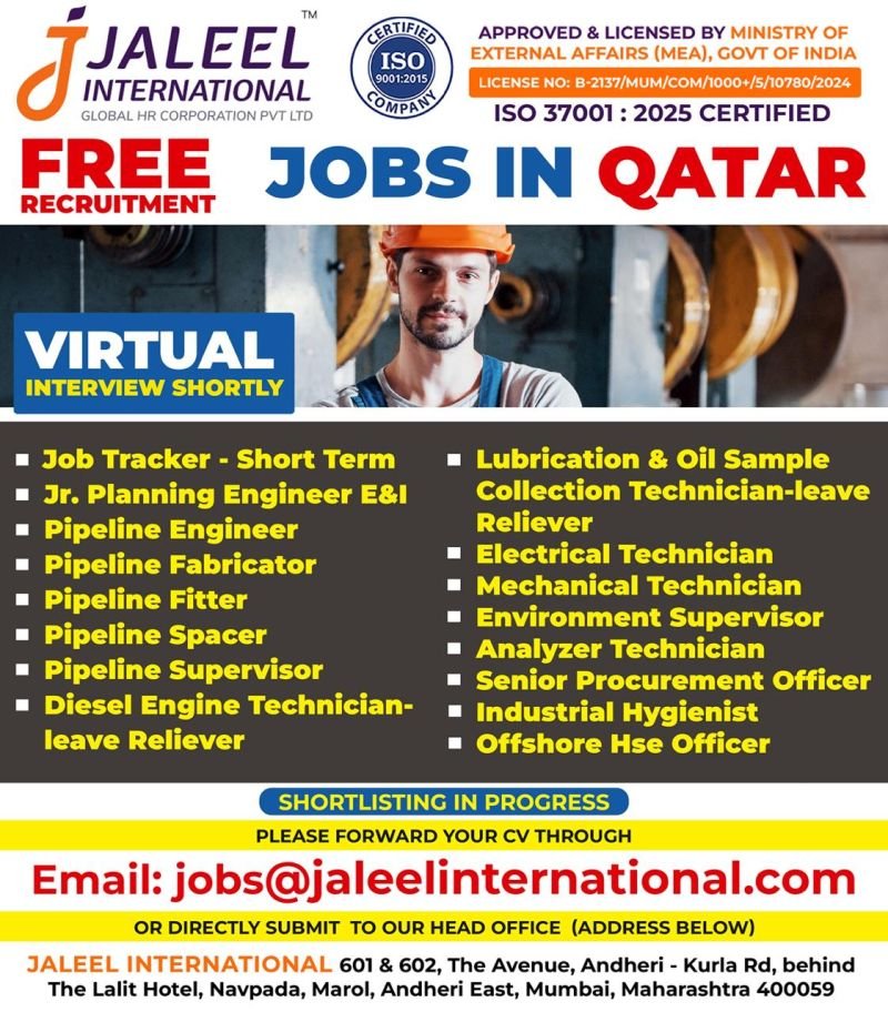 Jaleel International Global HR Corporation Pvt Ltd (ISO 9001:2015 & ISO 37001:2025 Certified, Licensed by MEA, Govt. of India) is conducting free recruitment for reputed Oil & Gas projects in Qatar.
