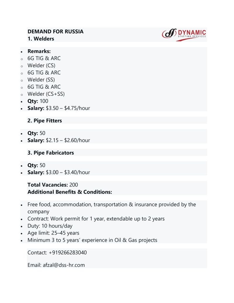 Dynamic Staffing Services is urgently recruiting skilled Welders, Pipe Fitters, and Pipe Fabricators for major Oil & Gas projects in Russia. Total 200 vacancies available with attractive hourly salaries and excellent benefits.