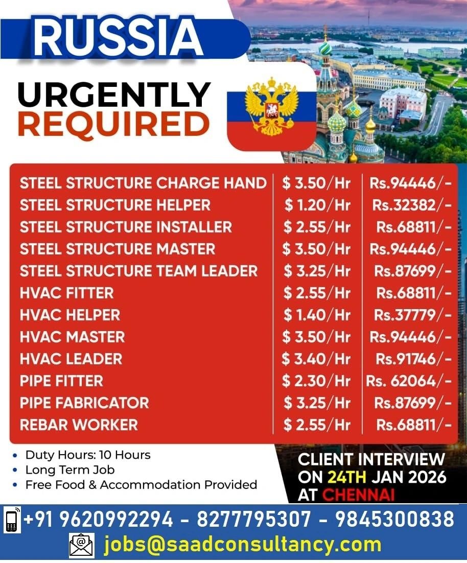 Exciting opportunities for skilled workers in Russia! A reputed company is urgently hiring experienced professionals in steel structure, HVAC, and piping for a long-term project. Attractive hourly wages, 10-hour duty, free food & accommodation provided. Client interviews scheduled on 24th January 2026 in Chennai – apply now!