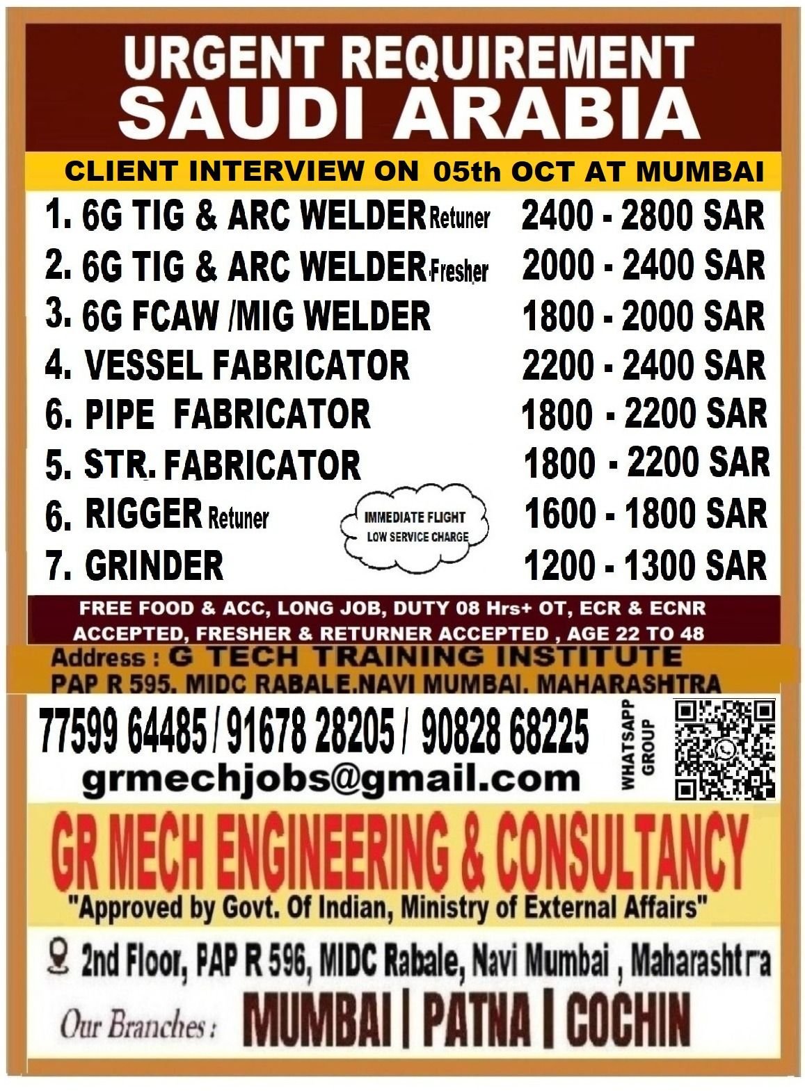Looking for a career opportunity in Saudi Arabia? GR Mech Engineering & Consultancy is urgently hiring skilled professionals for various roles. With a client interview scheduled for 05th October 2025 in Mumbai, this is your chance to join with free food & accommodation, immediate flight, and low service charges. Apply today!