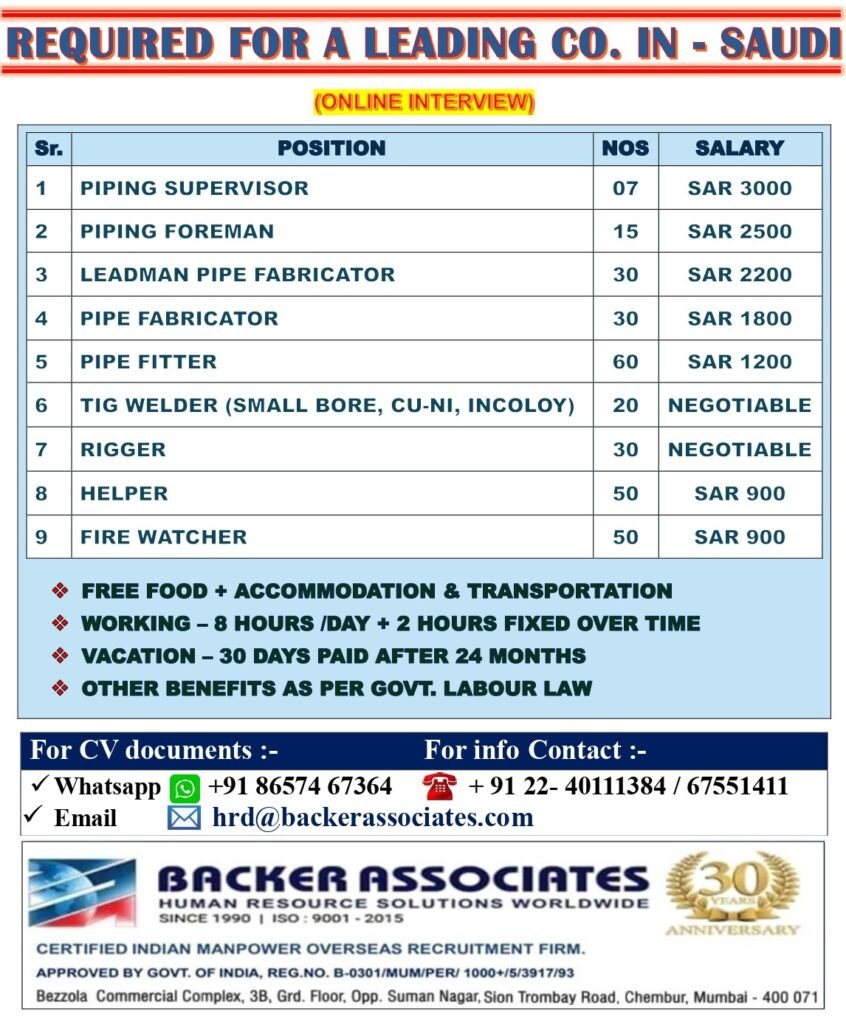 A leading company in Saudi Arabia is urgently hiring for multiple positions with Online Interviews. Attractive salaries, free accommodation, transportation, and excellent benefits. Age Limit: Up to 30 Years Only.