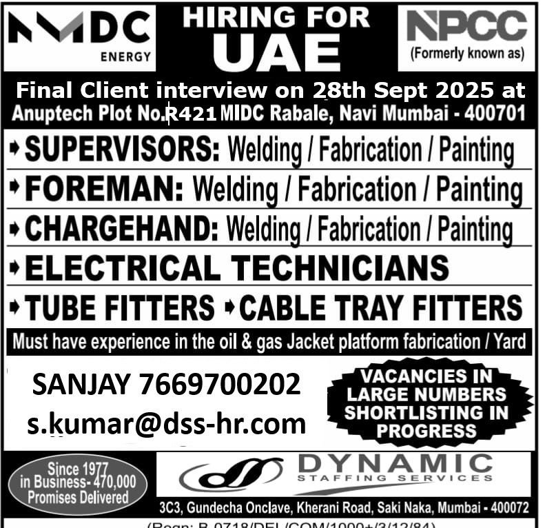 Looking for a career opportunity in the UAE? NMDC Energy is hiring skilled professionals for various roles with NPCC (formerly known as). With a final client interview scheduled for 28th September 2025 at Anuptech, Navi Mumbai, this is your chance to join a dynamic team. Apply today!