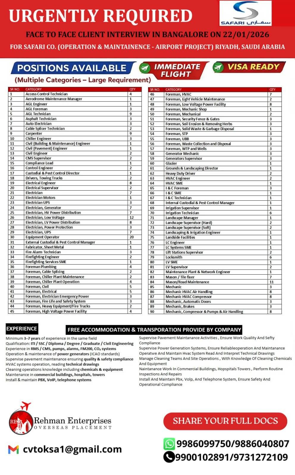 Interested candidates should immediately share their full documents (updated CV, experience certificates, educational certificates, passport copy, recent photo) to cvtoksa1@gmail.com