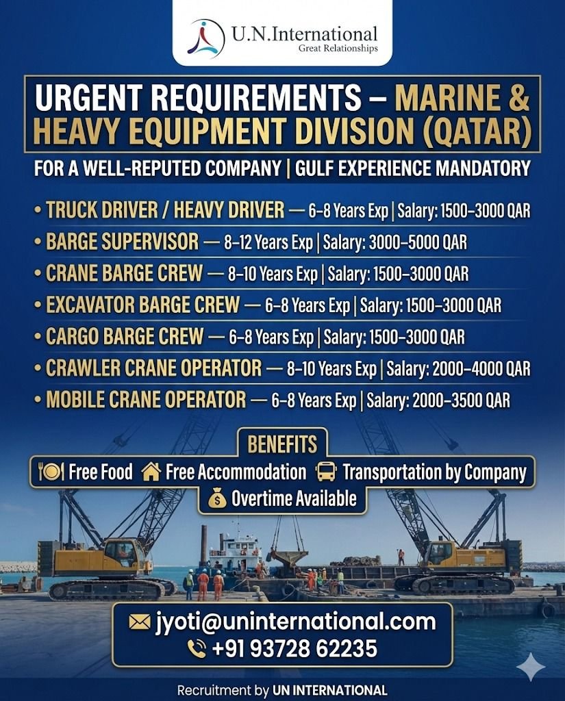 Are you an experienced professional in marine and engineering projects seeking high-paying jobs in Qatar? A well-reputed company is urgently hiring for marine construction and engineering roles in Qatar with Gulf experience mandatory. This is a free recruitment opportunity offering attractive benefits like free food, accommodation, company transportation, and overtime pay.
