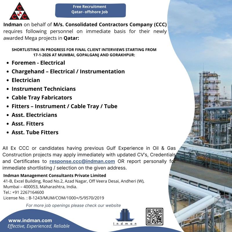 Consolidated Contractors Company (CCC), a world-leading engineering and construction giant, is hiring experienced personnel on an immediate basis for their newly awarded Mega Offshore Projects in Qatar. Recruitment by Indman Management Consultants Private Limited.