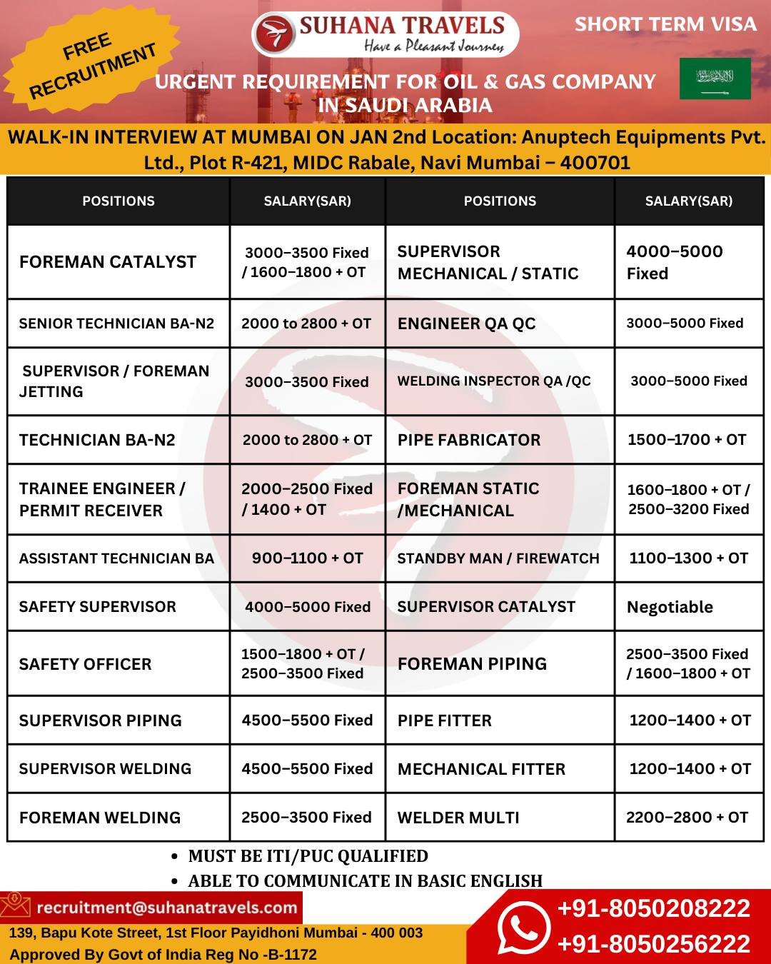 Free Recruitment opportunity for a leading Oil & Gas Company in Saudi Arabia! Suhana Travels is conducting Walk-in Interviews in Mumbai for short-term visa positions.