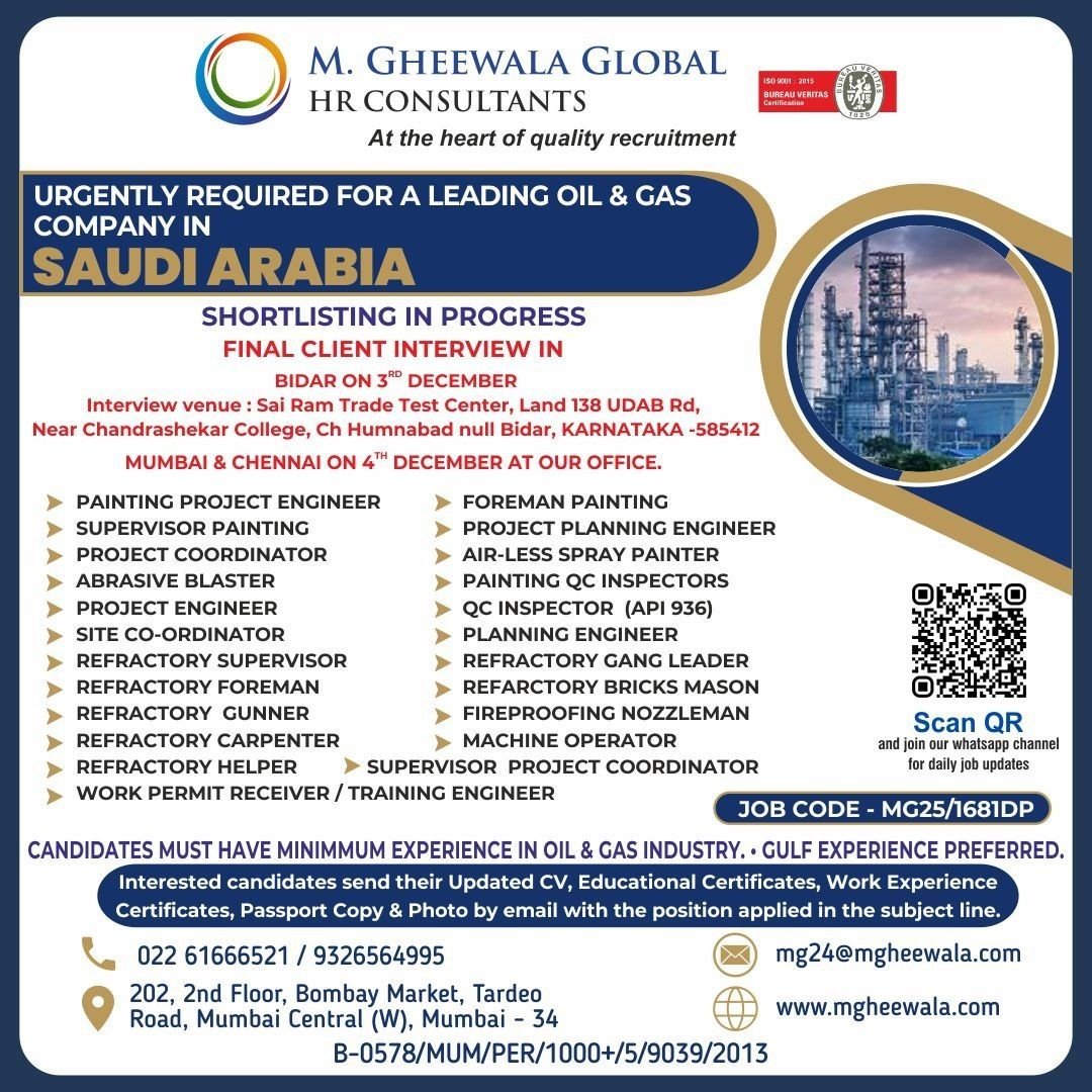Eager for high-paying oil & gas jobs in Saudi Arabia? M. Gheewala Global HR Consultants is urgently hiring skilled professionals for a leading KSA company—painting, refractory, planning, and QC roles. Minimum oil & gas industry experience required; Gulf exp preferred. Shortlisting in progress with final client interviews on 3rd Dec in Bidar, and 4th Dec in Mumbai & Chennai. Enjoy competitive salaries, free accommodation, transport, medical, and long-term contracts in Saudi’s energy boom!