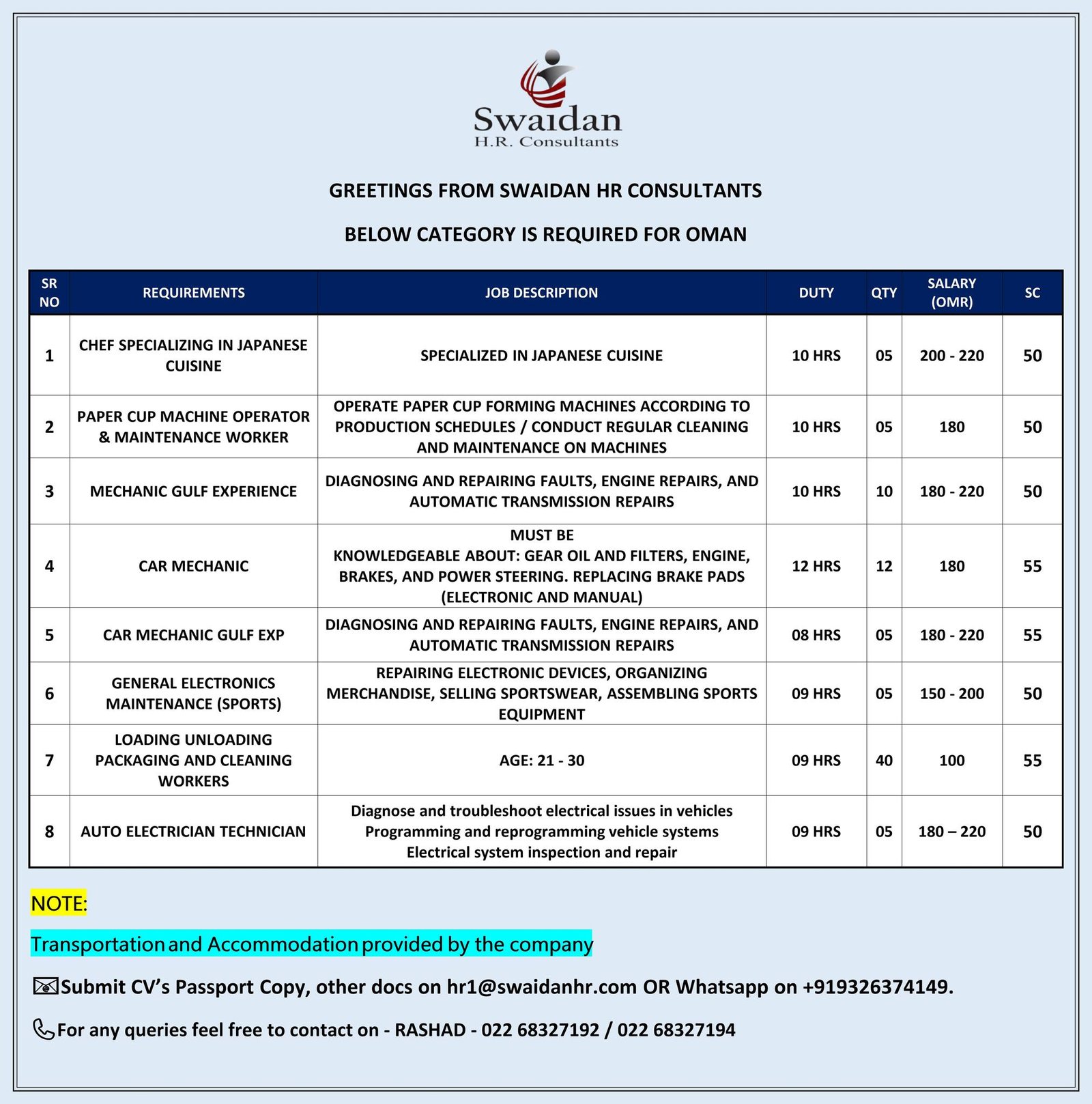 Available Positions – Oman (All with Food + Accommodation + Transport) :